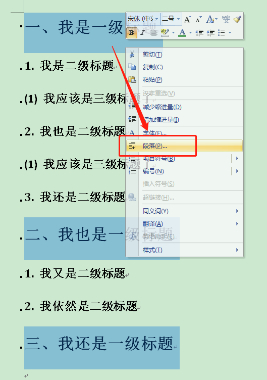 同样操作步骤选中二级标题,将它们的大纲级别改为二级;以此类推……