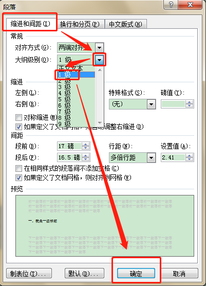 然后,在任意选中的标题上右键单击鼠标,点击“段落”,将里面的大纲级别改为一级;
