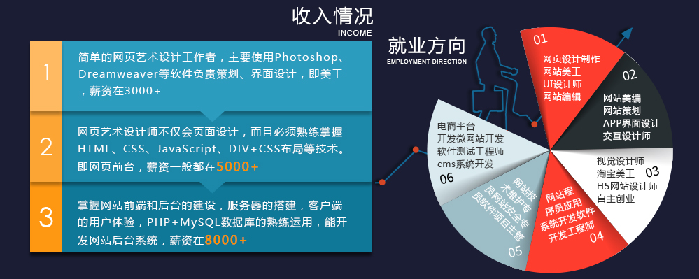 1、网站美工 2、UI设计师 3、网页设计制作 4、网站编辑 5、网站客服 6、网站美编 7、APP界面设计 8、网站策划 9、交互设计师 10、视觉设计师 11、H5网站设计师 12、淘宝美工 13、自主创业 |
